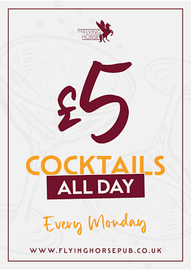 Located just a five-minute walk from Liverpool Street and Moorgate station, The Flying Horse is an authentic British pub serving up unbeatable pub classics, an excellent range of cask ales, cocktails, and more! From handcrafted burgers and homemade rustic pizzas to our popular lunchtime sandwiches, it's the perfect place to unwind with friends after work or enjoy a pub lunch with your team. Plus, with several HD TV screens and a large screen projector, you won’t miss a second of the latest live sport. Looking for a private space for after-work drinks, a business meeting, birthday party, or special occasion? Our upstairs function room is ideal! With a maximum capacity of 50 guests, it features a private bar, 3 large HD TV screens, a separate sound system, and a dartboard for added fun. Whether you're hosting a casual gathering or a big celebration, we’ve got you covered. Check out our pre-order menu with exclusive prices, including mixed food platters and varied drink options, perfect for larger events. Great food, great drinks, and great company—join us at The Flying Horse!